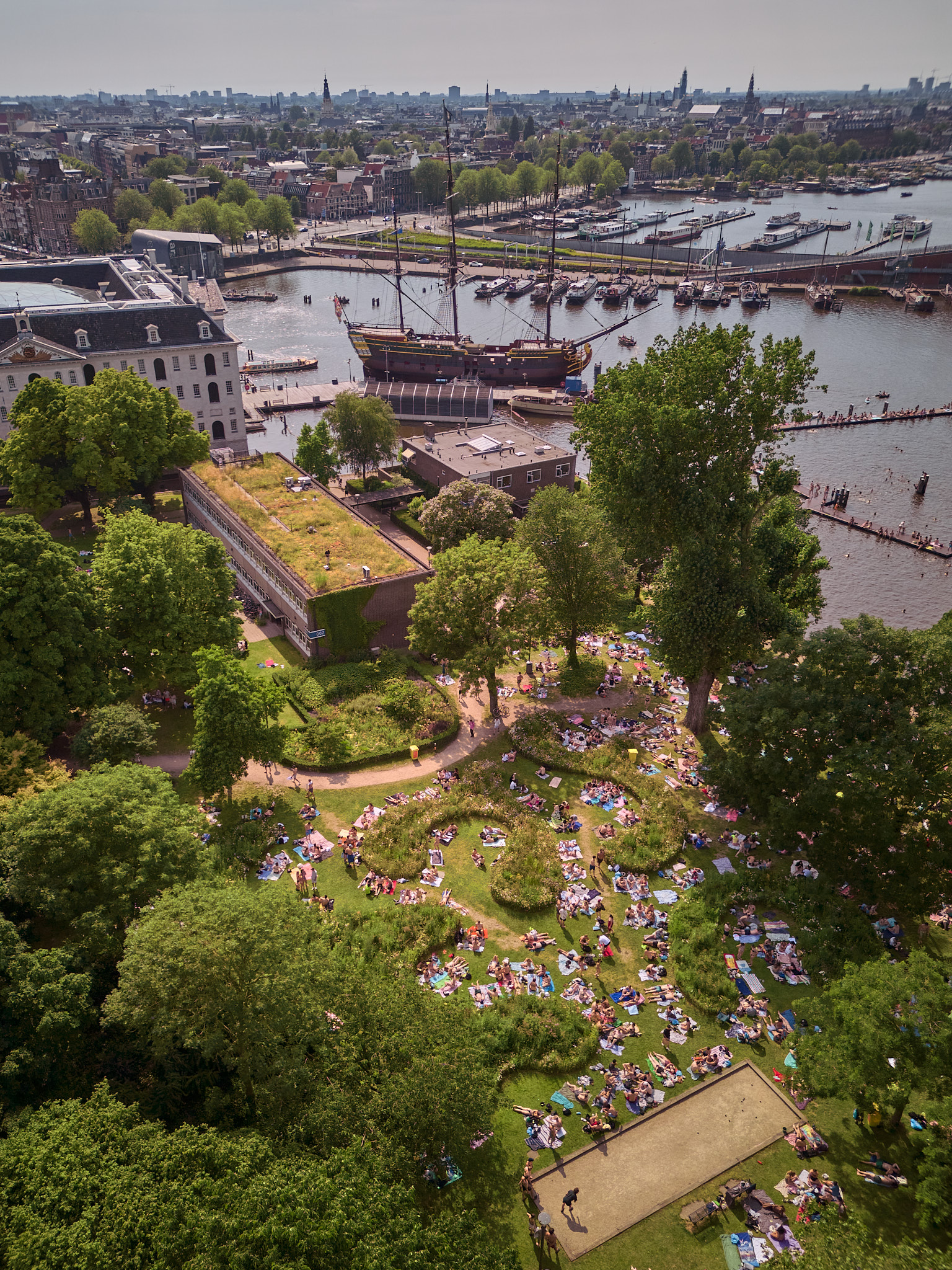 In de zomer verandert het Marineterrein van een oase van rust in een gezellige hotspot. Het water en het gras op de Voorwerf zijn dan plekken waar heel veel mensen tegelijk samenkomen om te genieten van het weer en het terrein. Met het experiment Graspannen onderzoeken wij hoe mensenmassa’s en drukte op een natuurlijke manier kunnen worden gestuurd en beheerst. Tegelijkertijd wordt de biodiversiteit vergroot en drinkwater bespaard.